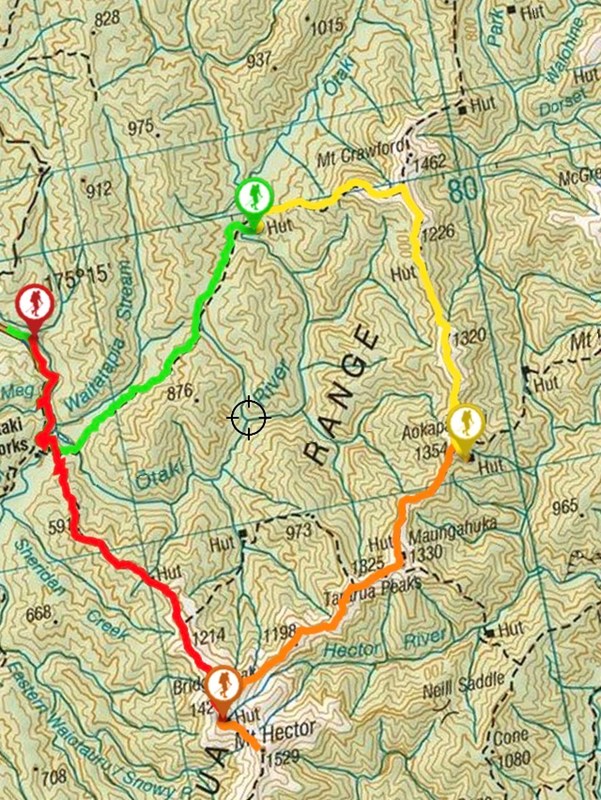Wake up early and pop up to the top of Hector for the sunrise, then back to Kime & spend the day crossing to Maungahuka. Hopefully we'll have plenty of time left in the day, and can continue through to Aokaparangi.