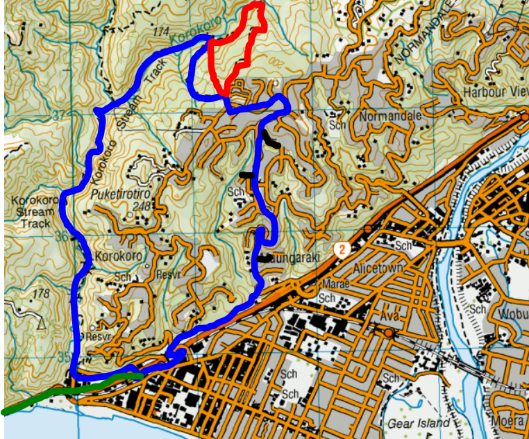 The plan is, meet at Wellington Train Station 11am, launch at 11:30am to train to Petone. For those that live closer to Petone, they can meet us at Petone Station. Go to Pito-One Road End, Walk up the Korokoro Stream Track, Picnic in the red area if people want.