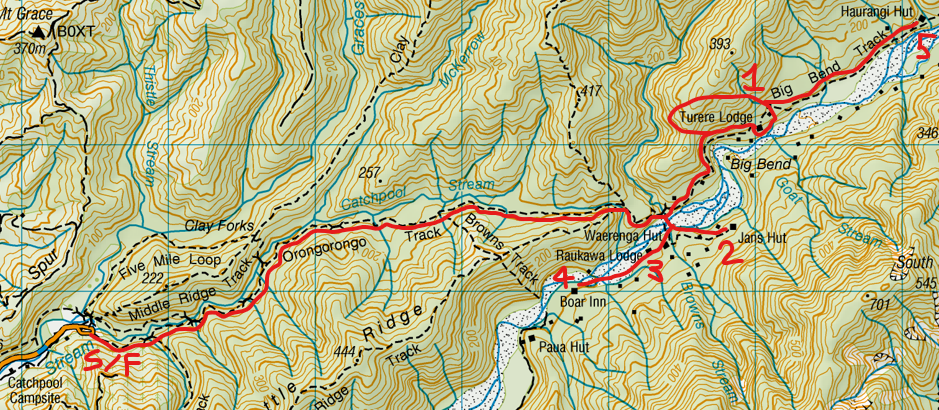 Day 1 (Tue 28 April) - We'll meet at Kelburn campus at 9am. We'll carpool to Catchpool Valley campsite (45min drive). It's an easy medium 2hr walk along the Ōrongorongo Track, which is mostly flat but ends with a steep descent to the river. It's then 30min walk along the Big Bend Track to Turere Lodge, which is a bit steeper and windier. After settling in we'll carry out maintenance tasks. We can then relax and socialise into the night.